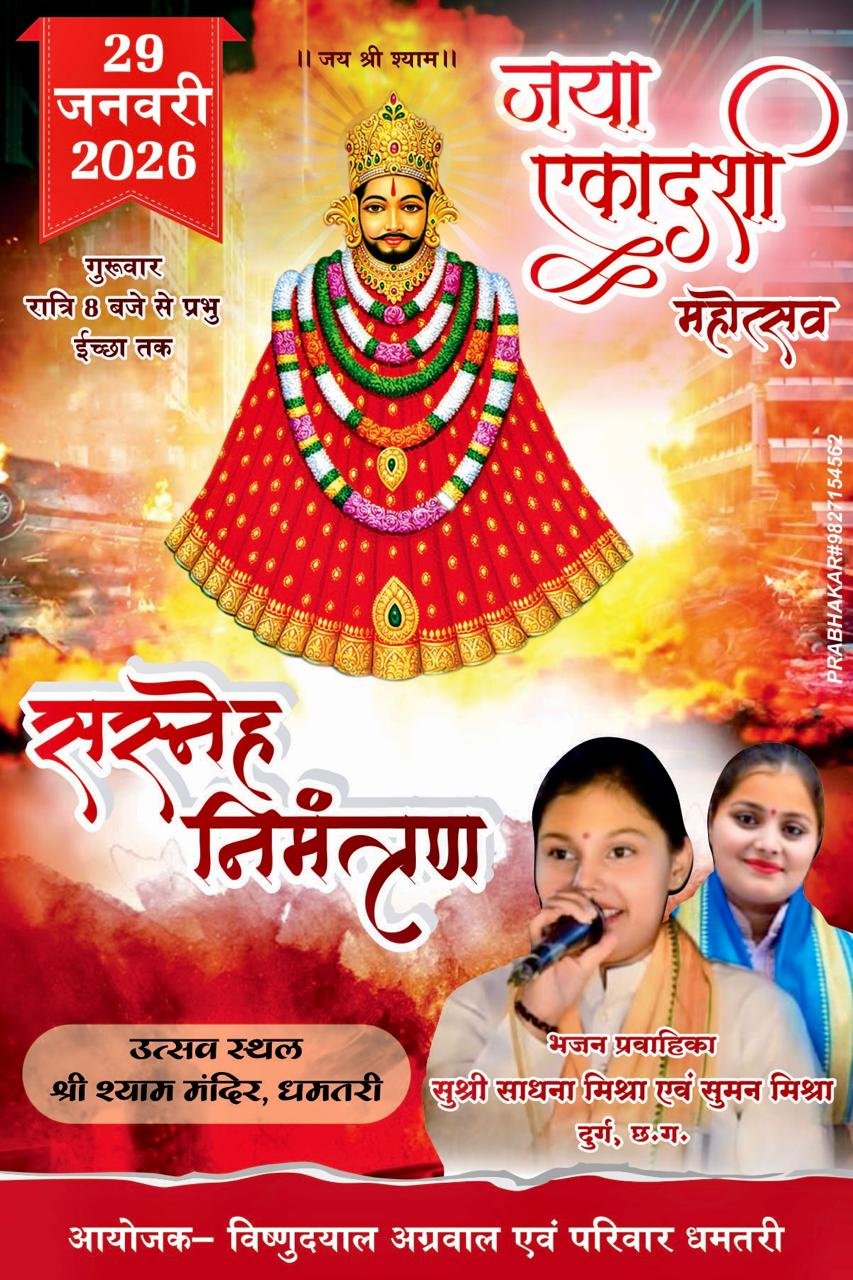 धमतरी/श्री श्याम प्रभु की भक्ति एवं संकीर्तन से सराबोर होने का पावन अवसर शहरवासियों को एक बार फिर प्राप्त होने जा रहा है। एकादशी के शुभ अवसर पर 29 जनवरी 2026, गुरुवार को रात्रि 8:00 बजे से श्री श्याम मंदिर, धमतरी में भव्य ‘श्याम भजन संध्या’ का आयोजन किया जा रहा है।