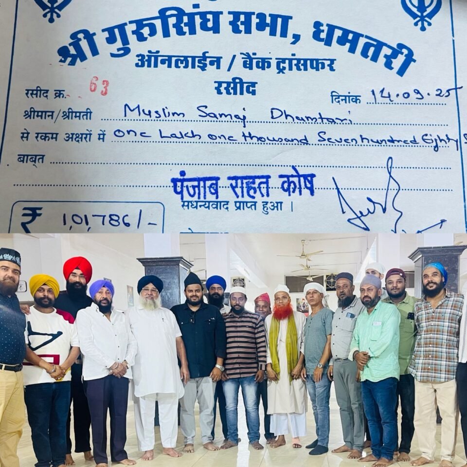 धमतरी/ पंजाब में आई भीषण बाढ़ से हजारों परिवार प्रभावित हुए हैं। इस कठिन समय में धमतरी के मुस्लिम समाज आगे बढ़कर इंसानियत और भाईचारे की मिसाल पेश की। आपसी सौहार्द और सामाजिक जिम्मेदारी को निभाते हुए मुस्लिम समाज ने कुल ₹1,01,786 की राशि जुटाई और इसे धमतरी के सिख समाज को सौंप दिया। यह धनराशि गुरुद्वारा प्रबंधन समिति के माध्यम से पारदर्शी तरीके से बाढ़ पीड़ितों तक पहुंचाई जाएगी।