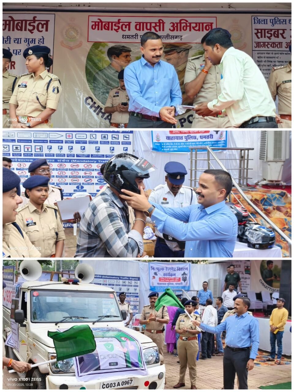 धमतरी/नवरात्रि अष्टमी पर धमतरी पुलिस ने गांधी मैदान में एक विशेष कार्यक्रम आयोजित कर 108 गुम हुए मोबाइल फोन उनके वास्तविक मालिकों को लौटाए। इस मौके पर सायबर जागरुकता रथ को हरी झंडी दिखाई गई और नुक्कड़ नाटक, पोस्टर-बैनर के जरिए सायबर अपराध, नशा मुक्ति और यातायात सुरक्षा पर नागरिकों को जागरूक किया गया।