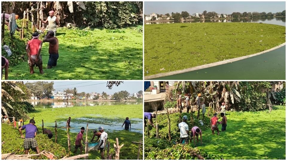 धमतरी/धमतरी शहर से लगा हुआ ग्राम रत्नाबांधा,मुजगहन में विशाल तालाब जो की बहुत प्राचीन तालाब है।गर्मी के दिनों को देखते हुए तालाब में जल स्रोत को बनाए रखने के लिए एवं उसके स्वच्छता को ध्यान में रखते हुए तालाब में व्याप्त जलकुंभी व खरपतवार की सफाई अभियान विगत तीन दिनों से युद्ध स्तर पर चल रहा है।