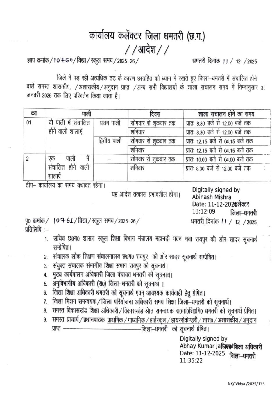 धमतरी/जिले में पड़ रही अत्यधिक ठंड को देखते हुए छात्रहित में जिला धमतरी में संचालित समस्त शासकीय, अशासकीय, अनुदान प्राप्त एवं अन्य सभी विद्यालयों के शाला संचालन समय में 3 जनवरी 2026 तक अस्थायी परिवर्तन किया गया है। यह परिवर्तन विद्यार्थियों के स्वास्थ्य एवं सुरक्षा को ध्यान में रखते हुए किया गया है। कलेक्टर श्री अबिनाश मिश्रा ने इस आशय के आदेश जारी कर दिए है । कार्यालय का समय यथावत रहेगा।